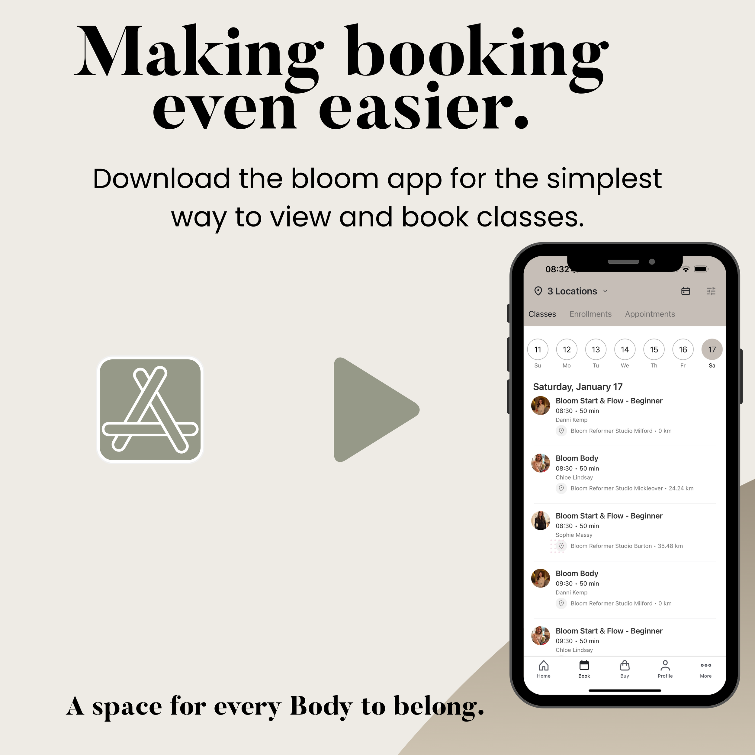 At Bloom, we leave embarrassment and judgment at the door. Our sessions are inclusive, welcoming, and focused on creating a safe space where you can move, breathe, and bloom in your own time. Whether it’s your first class or your hundredth, you’ll be met with encouragement, community, and instructors who genuinely care. No matter your shape, age, or ability- you belong here, and we can’t wait to see you thrive.