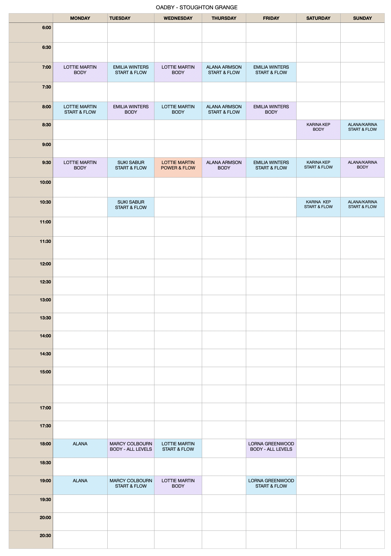 Timetables. Timetables for all studios are listed below. (classes can occasionally vary) , live bookings are available here